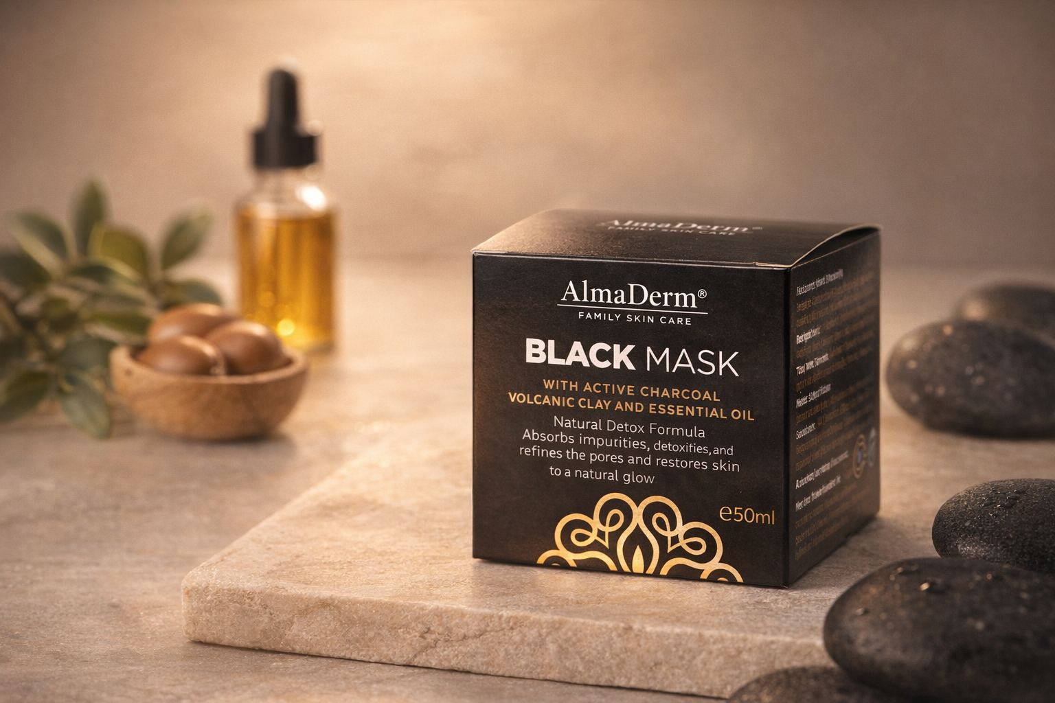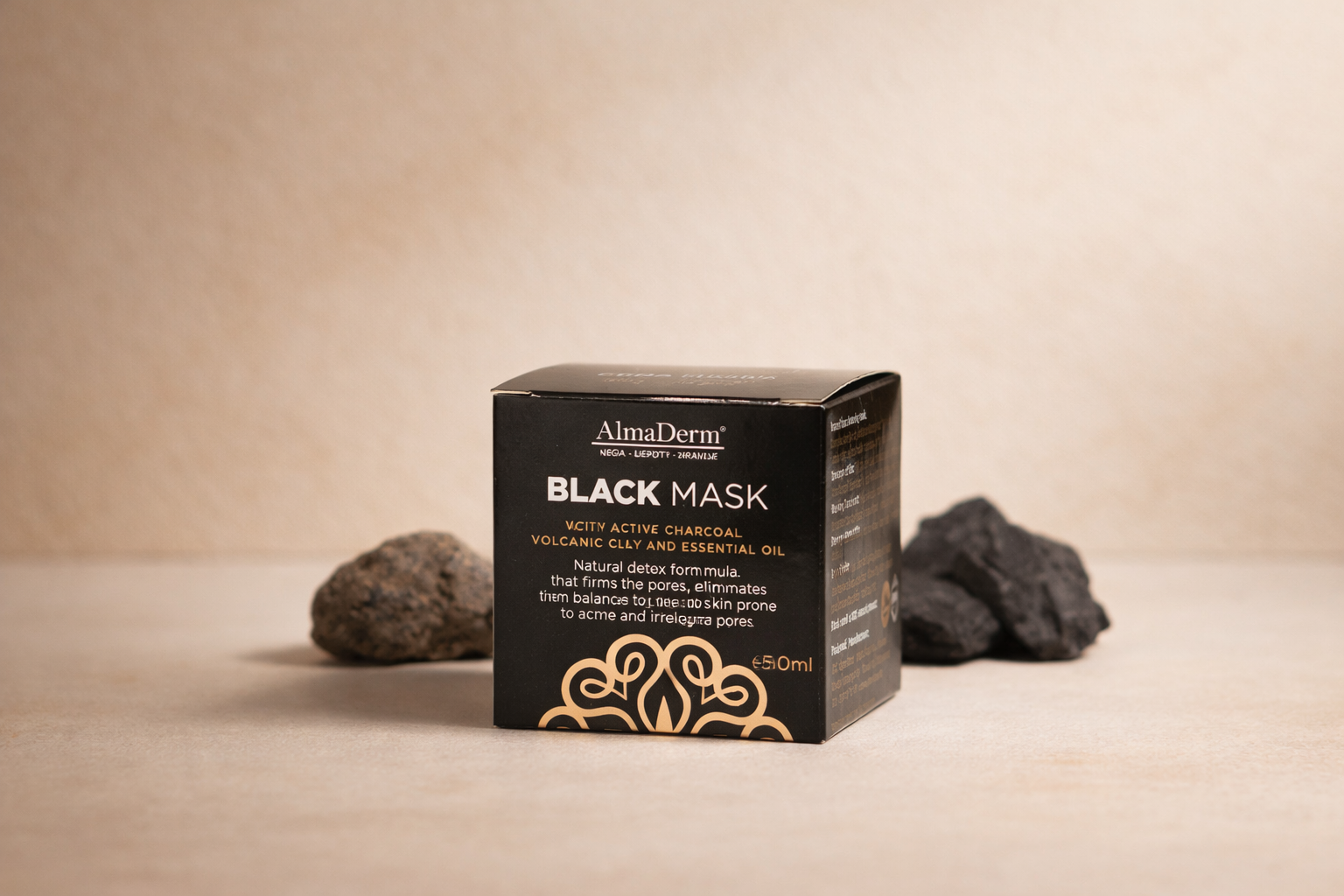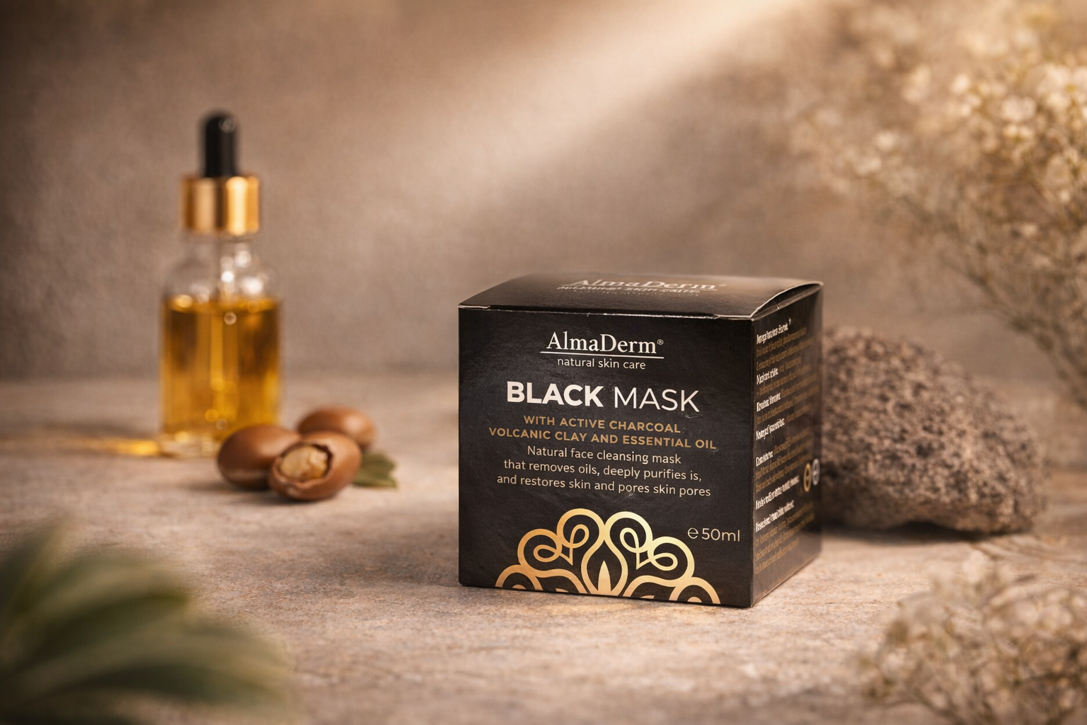 Discover the luxurious experience of our Black mask with volcanic clay and active charcoal, designed to elevate your total face care routine. This exquisite mask combines the deep cleansing properties of volcanic clay with the purifying effects of active charcoal, delivering a sensorial ritual that leaves your skin feeling refreshed and balanced. Created in small batches by AlmaDerm, a family-owned brand committed to natural, clean beauty, this mask embodies quality and elegance in every drop.